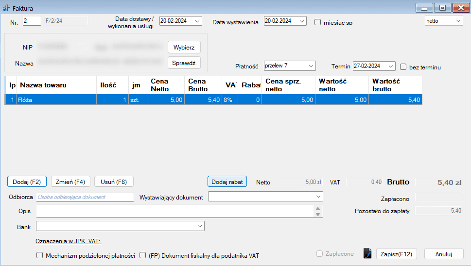 Następnie wypełniamy pozycje faktury. Również przebiega to podobnie co w innych programach. Towary od razu zapisujemy również w bazie do ponownego użycia.