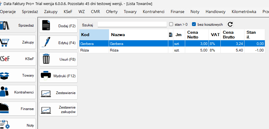 W zakładce „towary” mamy na bieżąco wgląd do artykułów, które sprzedajemy. Możemy też monitorować ceny oraz stany ilościowe. Nie jest to jednak typowy moduł magazynowy, ponieważ nie możemy tu wystawiać dokumentów magazynowych i kontrolować przepływu towarów.