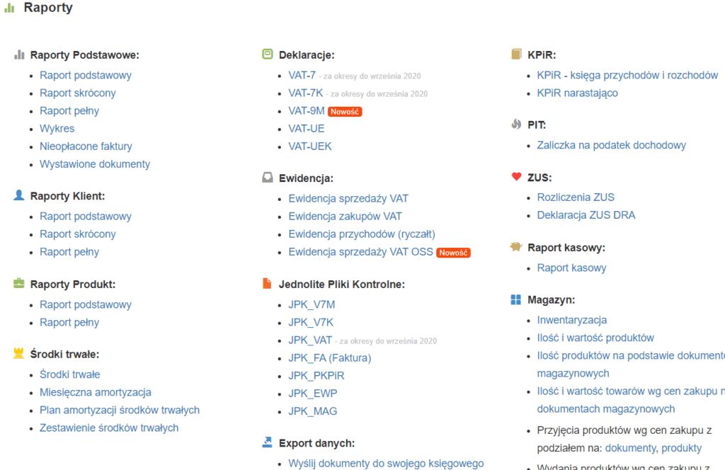 Od bezpłatnego pakietu różni się między innymi tym, że nie ma tu limitu dokumentów, możemy dodać do 3 użytkowników do konta, mamy rozszerzone raporty, możemy generować i wysyłać bezpośrednio z programu pliki wymagane przez Urząd Skarbowy – JPK_V7M, JPK_V7K oraz JPK_FA. Oprócz tego dostępna jest pełna ewidencja VAT, przychodów (ryczałt), KPiR oraz deklaracje VAT-UE.