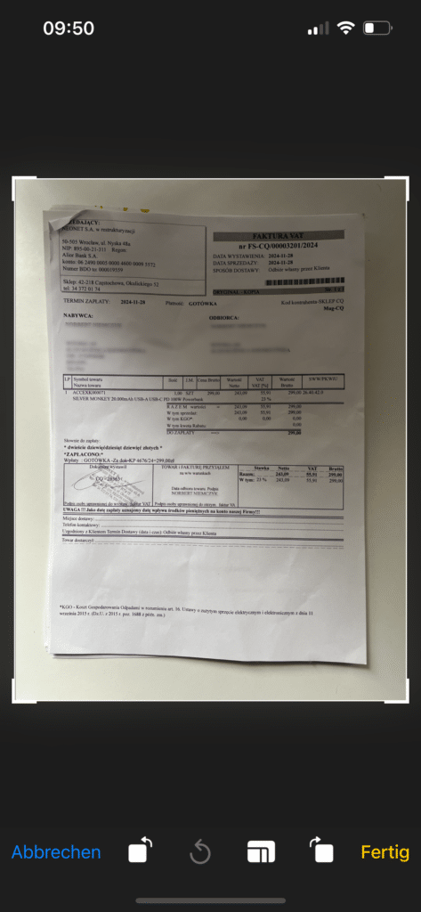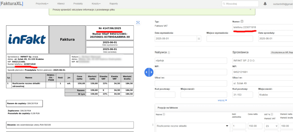 W innym przypadku jako numer faktury, OCR wskazał mi numer telefony sprzedającego. Zdarzyło się to mimo tego, że faktura była naprawdę dobrej jakości.