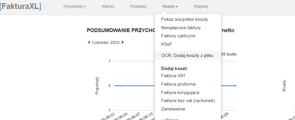 Aby aktywować OCR, na naszym koncie FakturaXL musimy przejść do zakładki „Koszty–>OCR: Dodaj koszty z pliku”. Jeśli nie masz jeszcze konta w FakturaXL, możesz je założyć za darmo tutaj.