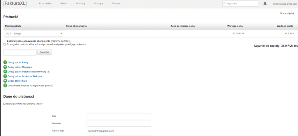 Aby korzystać z OCR w FakturaXL, nie musimy posiadać płatnego konta. OCR jest również dostępny w darmowym planie, jednak musimy wykupić odczyty osobno.