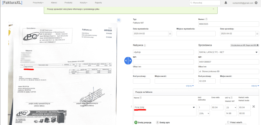 Z drugiej jednak strony, plik gorszej jakości jest gorzej odczytany. W przypadku poniżej, pozycja na fakturze według OCR to „PLN 23%”, podczas gdy w rzeczywistości powinno widnieć tam „Usługa serwisowa”.