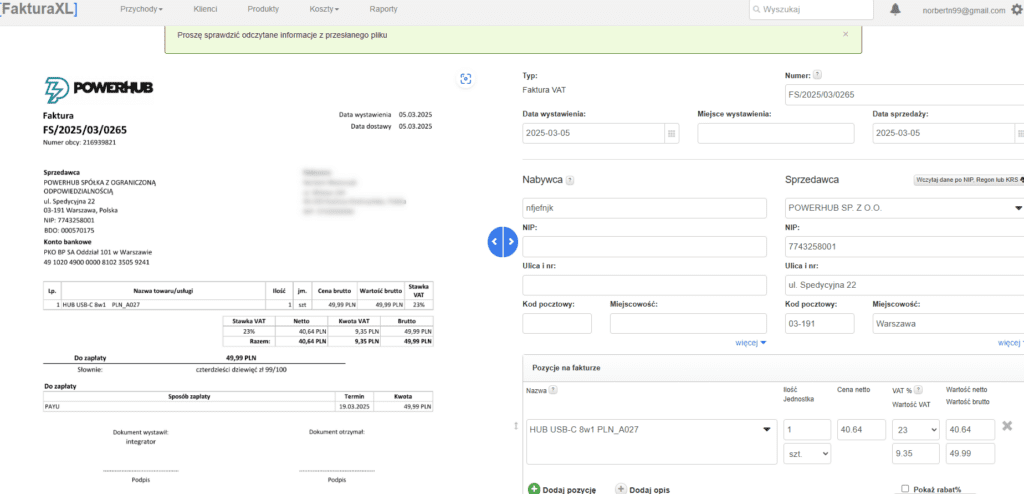 Przykładowo, jeśli faktura jest wrzucona z pliku prosto z programu do wystawiania faktur, to dane są odczytywane poprawnie.