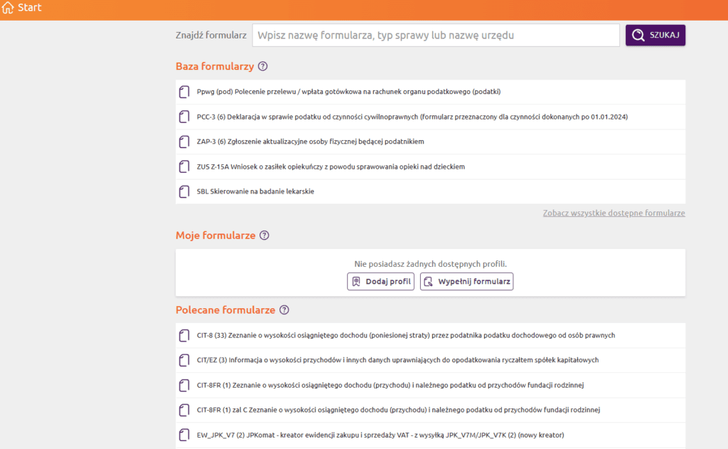 Prawdopodobnie formularz, którego poszukujemy znajdziemy w kategorii „polecane formularze”, ponieważ są tu wyświetlane te najbardziej popularne. Nawet jeśli nie, to dany formularz odnajdziemy wpisując odpowiednią frazę w wyszukiwarkę.