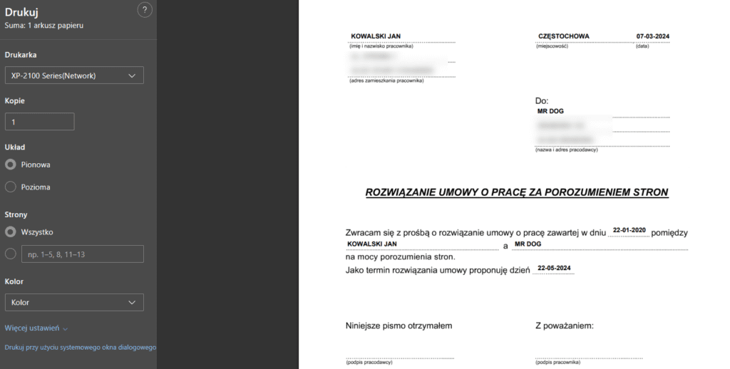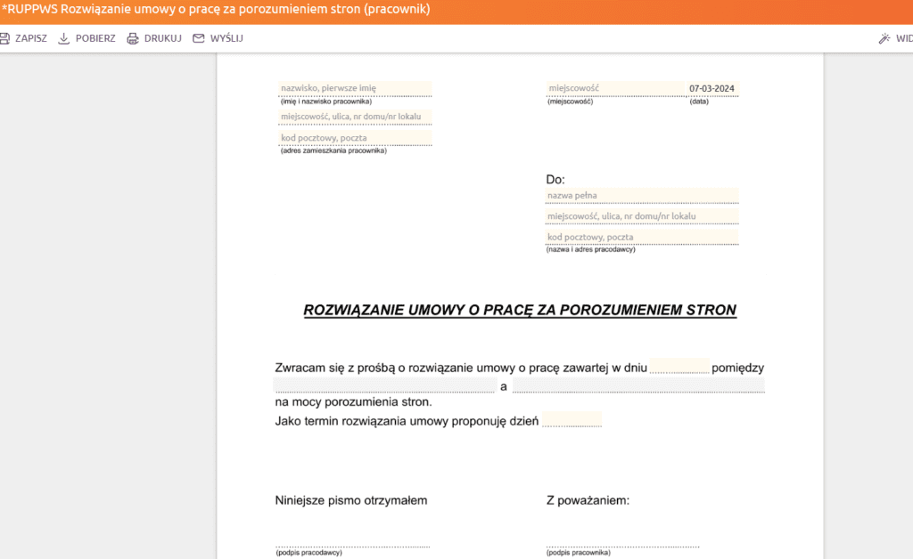 Otworzyłem sobie przykładowy formularz, który jest rozwiązaniem umowy za porozumieniem stron. Każdy formularz mamy gotowy i musimy jedynie wpisać odpowiednie dane.