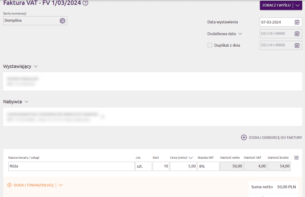 Fakturę możemy wystawić w bardzo szybki sposób. Dane nabywcy uzupełniają się automatycznie z bazy GUS, więc musimy znać jedynie NIP kontrahenta. Przy okazji kontrahent zapisuje się w systemie.