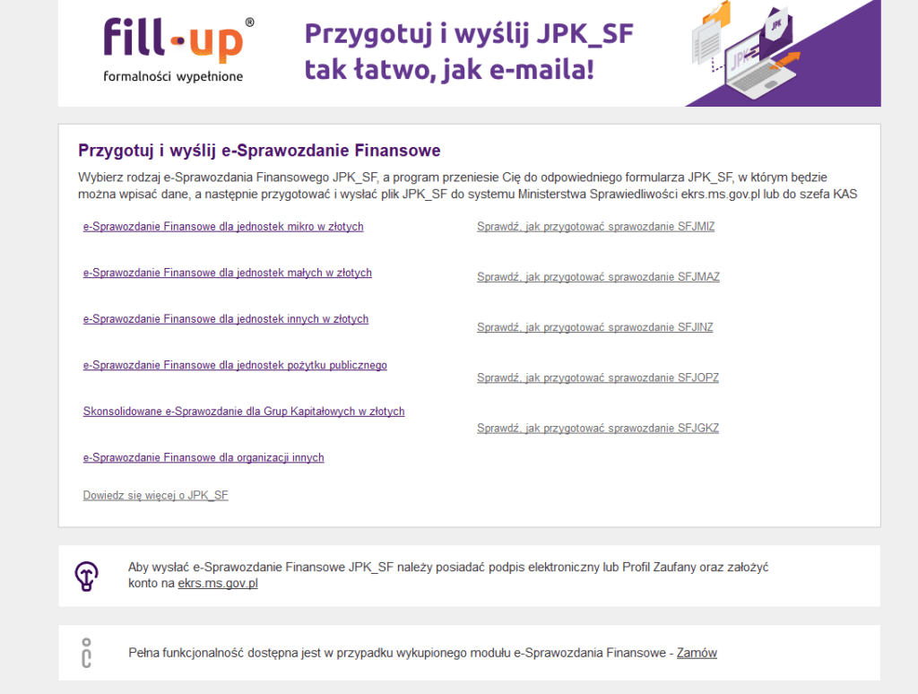 Taniej w pakiecie z e-SF: Pakiet zarówno z formularzami, jak sprawozdaniami finansowymi, który kosztuje od 642,50 zł rocznie.
