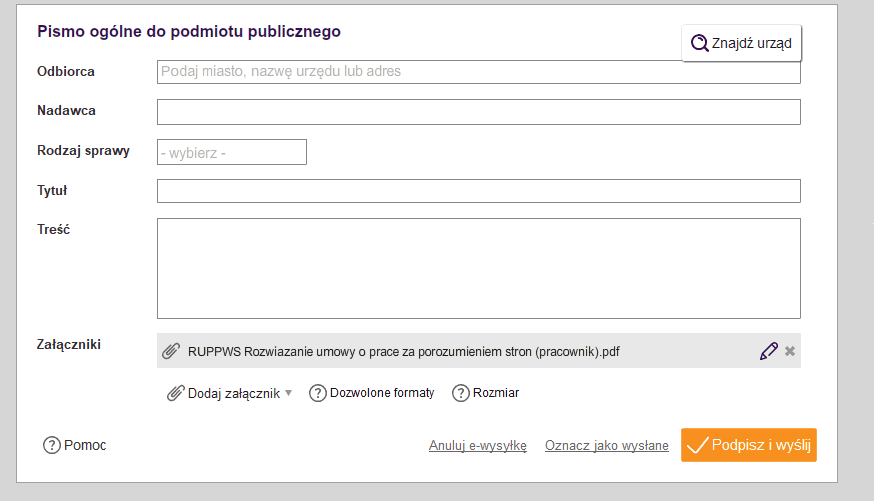 Ponadto każdy dokument możemy wysłać e-mailem na dowolny adres bezpośrednio z systemu, zapisać w systemie, na komputerze, lub co bardzo ważne wysłać przez ePUAP. Wystarczy jedynie wskazać odpowiedni urząd, podpisać a na koniec wysłać.