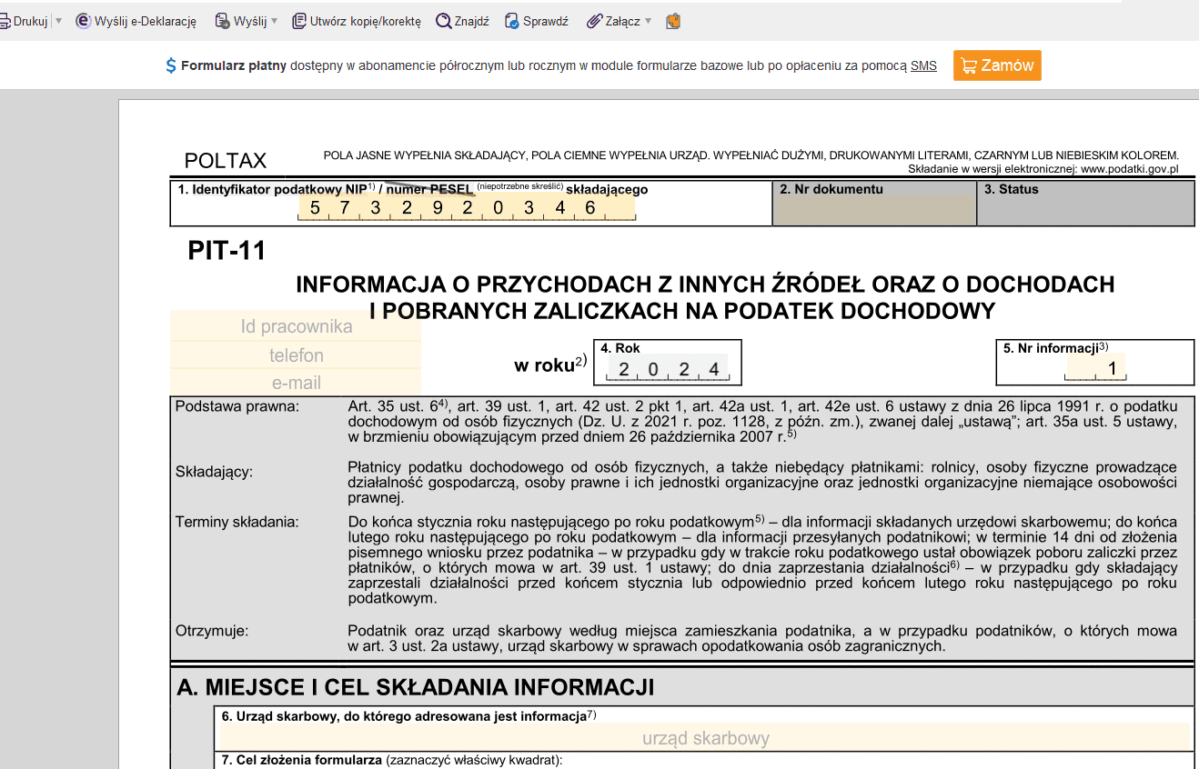Formularze bazowe: Od 285 zł rocznie. Im droższy pakiet, tym większy limit możliwości utworzenia PIT-11.
