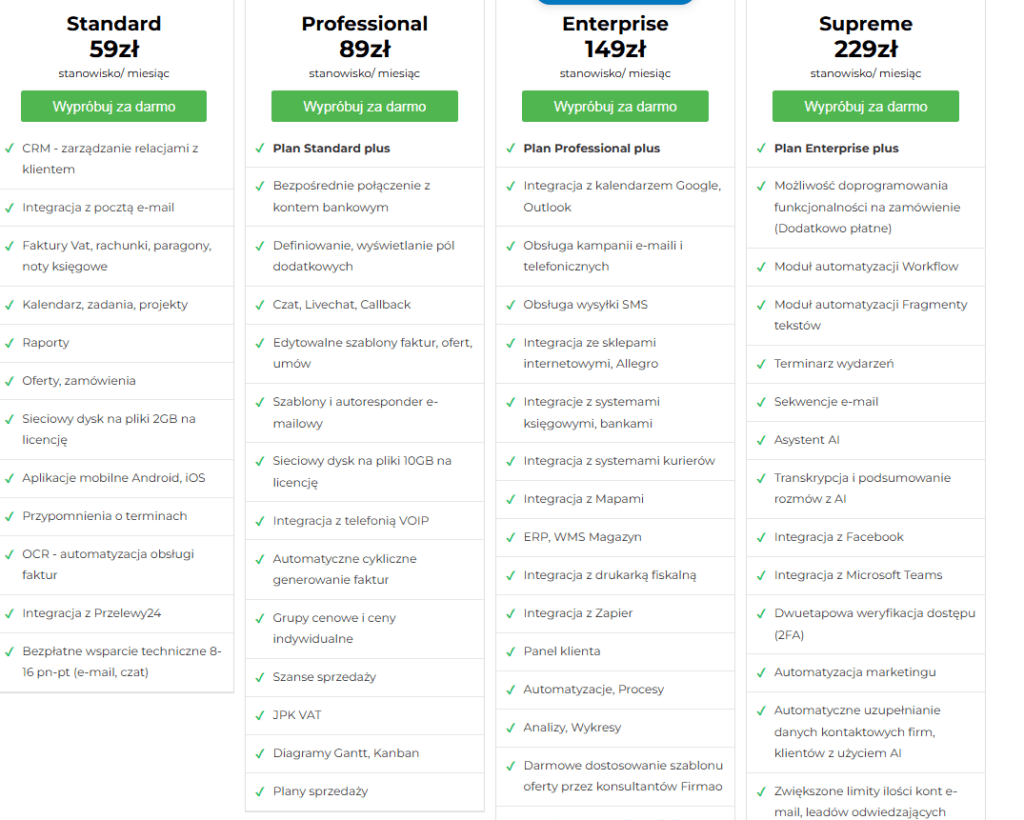 • Standard: dla freelancera, małego biura bez skomplikowanej sprzedaż, oraz jeśli potrzebujesz tylko CRM, faktur i kalendarza.