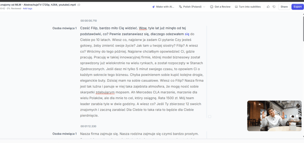 Obok transkrypcji, Happy Scribe może również generować napisy do filmów. Po wybraniu materiału wideo, napisy wygenerują się w kilka minut. Jakość rozpoznawania mowy i tworzenia z niej tekstu również jest na bardzo wysokim poziomie i w zasadzie nie ma błędów.