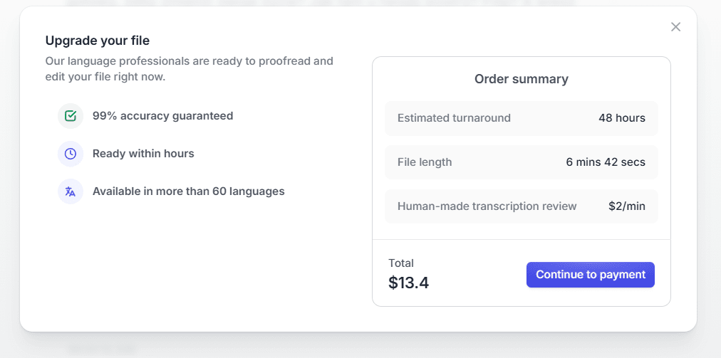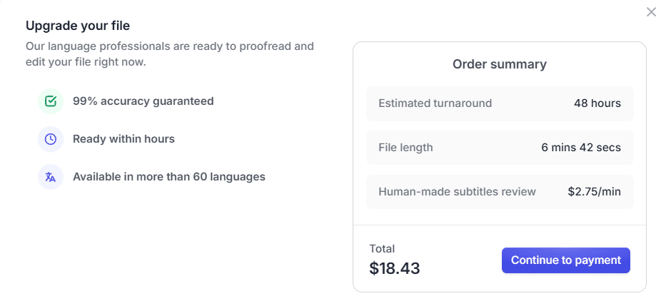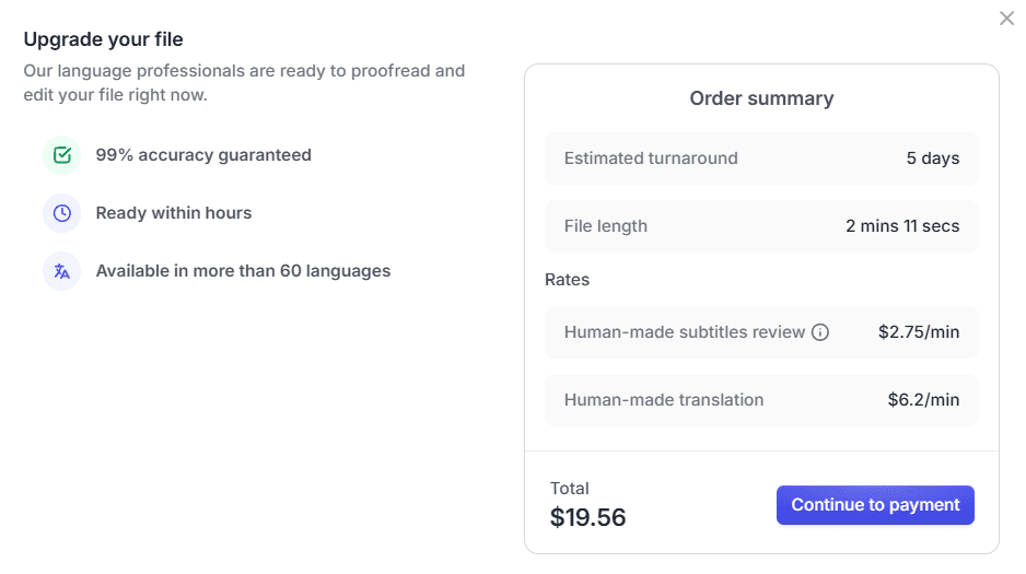 Jeżeli chodzi o ceny usług wykonywanych przez prawdziwe osoby, to był już on wspomniany wcześniej. Minuta transkrypcji kosztuje $2, minuta tworzenia napisów $2.75, a minuta tłumaczeń $2/75 lub $6.20.