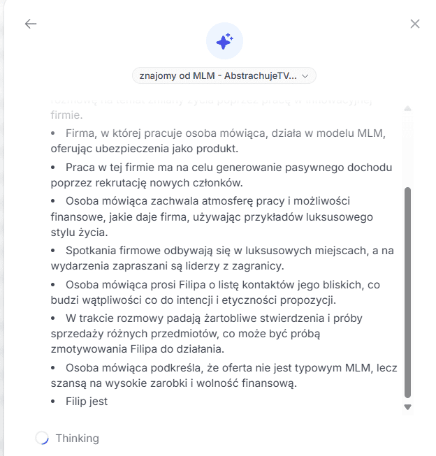 Warto jeszcze wspomnieć o funkcjach AI, które są dostępne przy okazji tworzenia transkrypcji. Możemy poprosić sztuczną inteligencję np. o napisanie podsumowania tekstu, stworzenia rozdziałów, czy nawet utworzenie artykułu na podstawie transkrypcji.