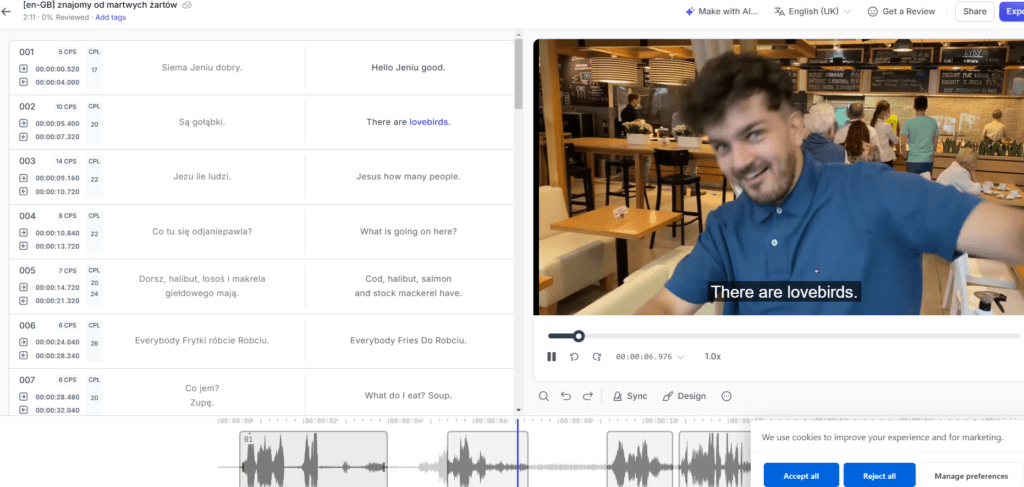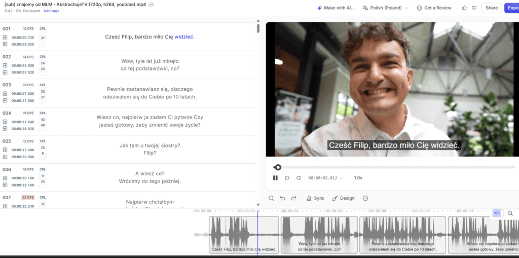 Większość roboty wykonuje za nas Happy Scribe a naszym zadaniem jest zasadniczo kontrolowanie poprawności i ewentualna edycja wyglądu napisów.