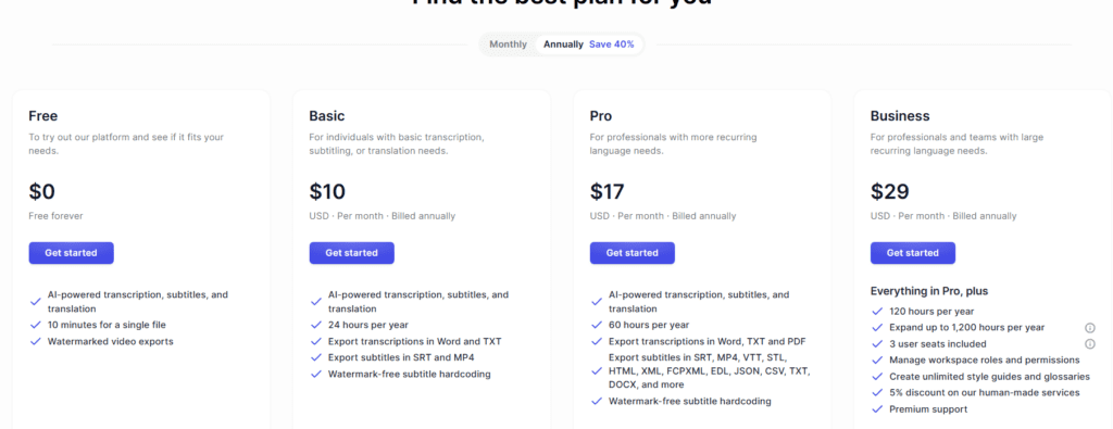 Plan Business za $29/mies. ma aż 1200 godzin rocznie na transkrypcje, napisy i tłumaczenia, oraz zniżki na usługi wykonywane przez prawdziwe osoby.