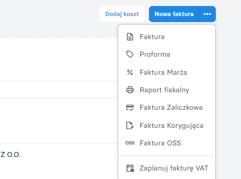 W pierwszym kroku klikamy niebieski przycisk „Nowa faktura”. Jeśli chcemy wystawić inny dokument niż faktura, klikamy w trzy kropeczki obok.