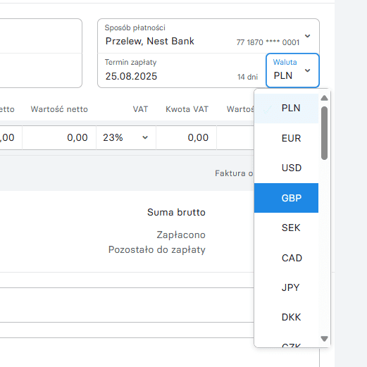 Jeśli masz klientów z zagranicy, możesz wystawiać im faktury w obcej walucie, takiej jak euro, dolar amerykański, czy funt brytyjski. Naliczyłem w sumie 37 różnych walut.