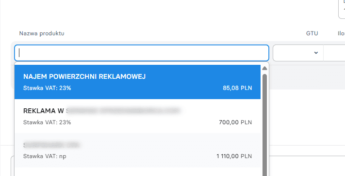 To samo jest z produktami lub usługami na fakturze. Możesz zapisać to, co sprzedajesz, a podczas wystawiania faktury tylko wybrać z listy, wraz z przypisaną ceną oraz stawką VAT.