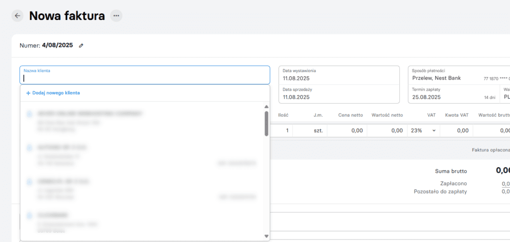 Jeżeli wystawiasz jakiemuś klientowi regularnie faktury, możesz go dodać do systemu. Dzięki temu następnym razem nie musisz uzupełniać jego danych, tylko wybrać go z listy.
