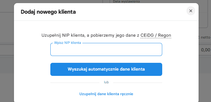 U góry po lewej stronie uzupełniamy dane klienta. Klikamy niebieski przycisk „Dodaj nowego klienta”, a następnie podajemy jego NIP.