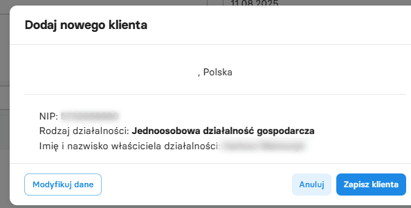 Czasem może zdarzyć się, że z jakiegoś powodu system nie zaciągnie wszystkich danych, dlatego będziemy musieli je modyfikować ręcznie. Gdy wszystko będzie ok, klikamy „zapisz klienta”.