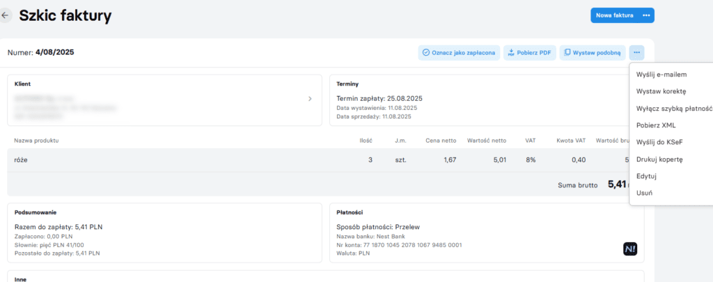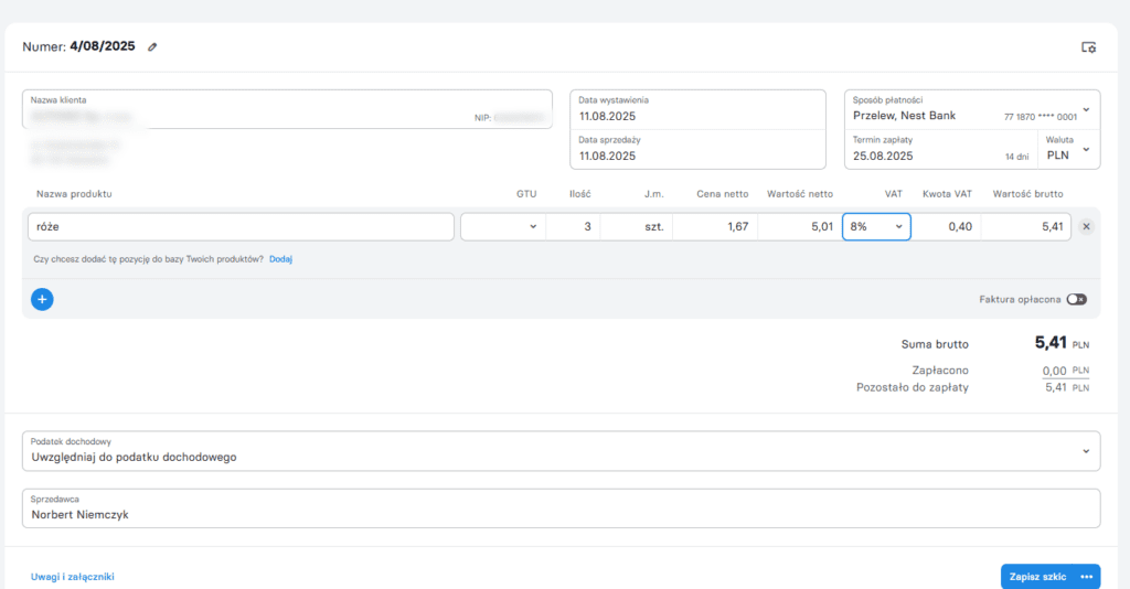 Teraz uzupełniamy pola na fakturze. Data wystawienia i sprzedaży uzupełnią się automatycznie, ale można je zmienić. Sprawdź również sposób płatności, termin zapłaty, oraz walutę. Następnie wpisz nazwę produktu lub usługi, którego dotyczy faktura i wybierz ilość, cenę, stawkę VAT, oraz ewentualny kod GTU. Wybierz też, czy faktura została opłacona, czy nie. Na dole możesz wpisać uwagi lub dodać załącznik. Gdy wszystko jest gotowe, kliknij zapisz szkic.