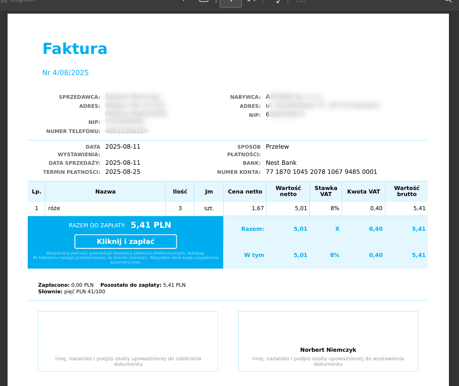 Wystawiając fakturę, możesz umieścić na niej przycisk szybkich płatności. Twój klient będzie mógł na niego kliknąć i od razu opłacić kwotę na fakturze.