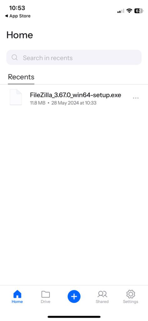 Jeśli chodzi o aplikację mobilną, jest ona dość prosta w obsłudze. U dołu znajduje się pięć przycisków funkcyjnych, w tym przycisk przesyłania plików z telefonu na dysk.