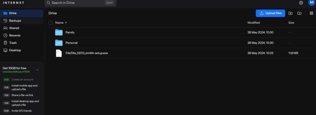 Interfejs główny Internxt jest czysty i przejrzysty. W centralnej części znajdziesz swoje pliki i foldery, a po lewej stronie zakładki, takiej jak między innymi kosz, backupy, czy udostępnione pliki.