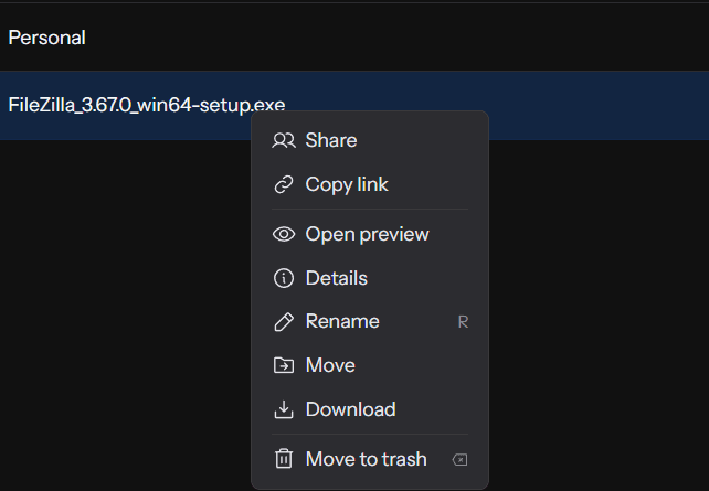 W panelu główny z plikami, znajdziesz zsynchronizowane pliki. Po kliknięciu w nie prawym przyciskiem myszy, możemy je udostępniać, kopiować linki, otworzyć podgląd, szczegóły, zmienić nazwę, przenieść, pobrać, oraz usunąć.