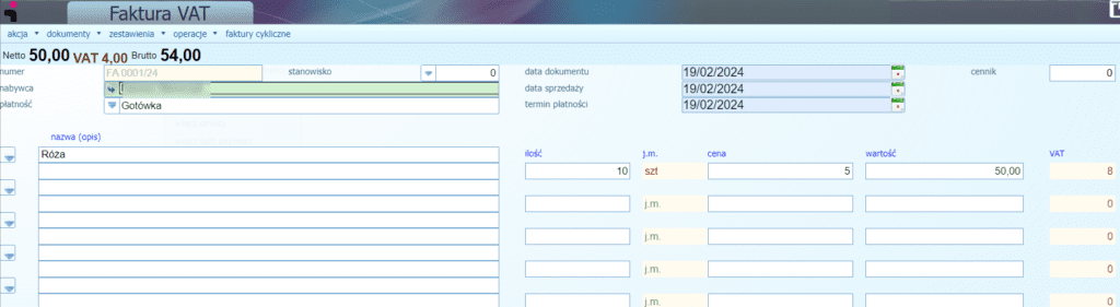 Jeśli chodzi o płatność, to nie mamy do wyboru sposobu płatności, a musimy go wpisać ręcznie. Pozycje na fakturze możemy wpisać ręcznie lub wybrać produkt z listy, o ile zapisaliśmy go w systemie.