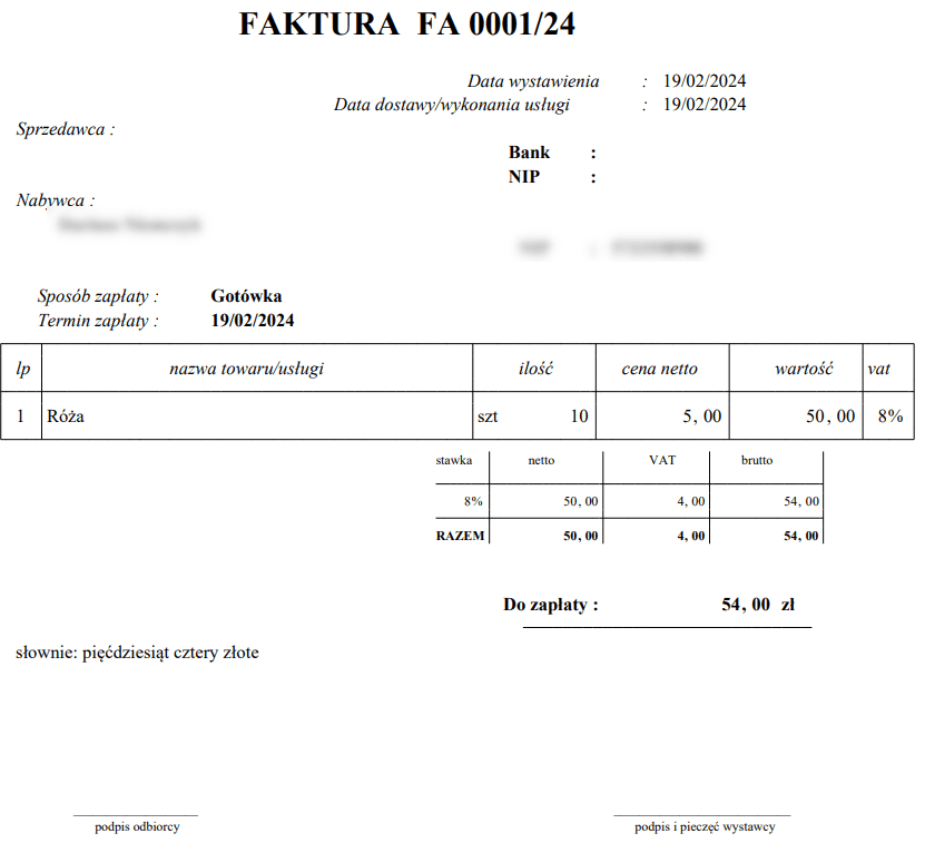 Faktura przez nas wystawiona będzie widniała w systemie i ujmie się w statystykach. Możemy ją wydrukować. Nie możemy zmieniać jej wyglądu, czy wgrywać naszego logo, ale możemy edytować zawartość stopki.