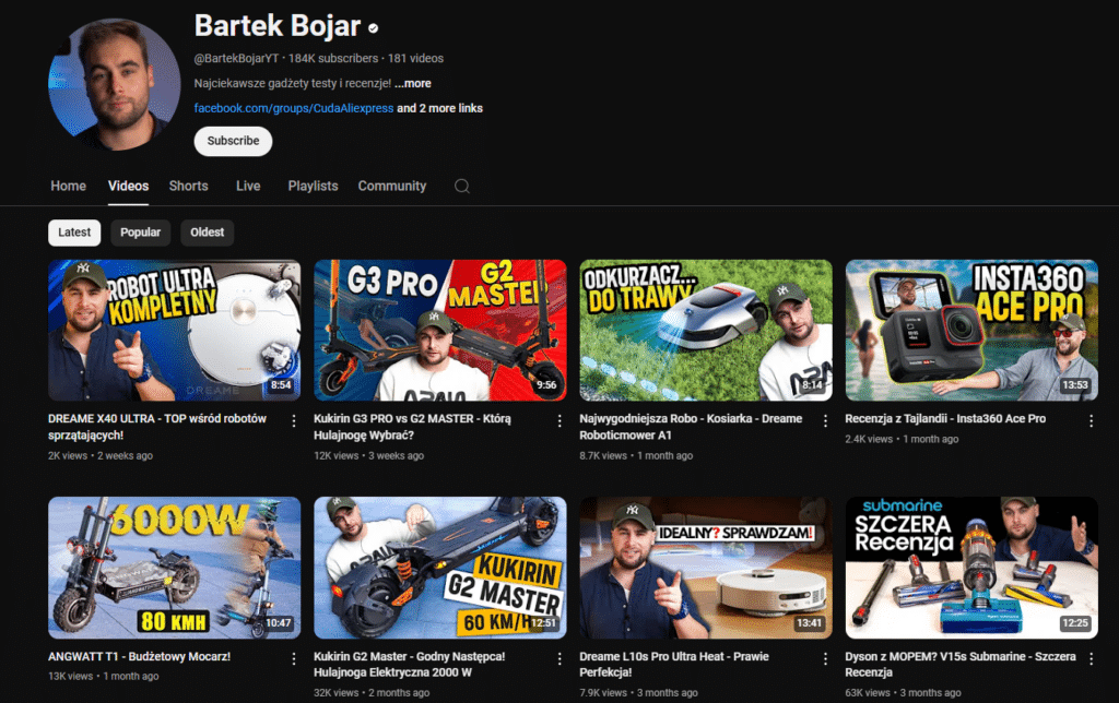 Kanał Bartka Bojara to dobry przykład afiliacji na YouTube. Twórca nagrywa recenzje, porównania i testy popularnych gadżetów, a w opisach filmów zamieszcza linki afiliacyjne.