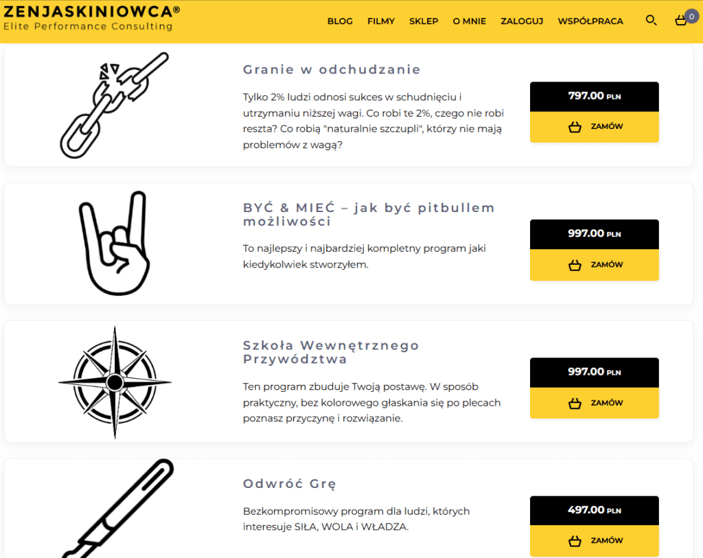 Zen Jaskiniowca to dobry przykład influencera, który sprzedaje swoje kursy. W serwisie YouTube zamieszcza podcasty z rozwoju osobistego, podczas których reklamuje kursy na swojej stronie internetowej.