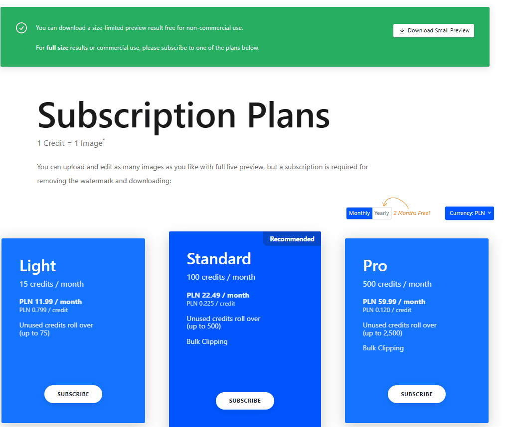 Aby pobierać w pełnych wymiarach oraz do użytku komercyjnego, Clipping Magic oferuje płatne plany. Każdy plan posiada pewną liczbę kredytów, gdzie jeden kredyt to jedno zdjęcie w miesiącu. Przykładowo, w planie Standard możemy edytować do 100 zdjęć miesięcznie. Niewykorzystane kredyty przechodzą na kolejny miesiąc.