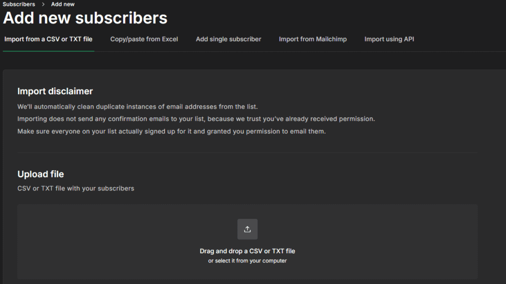 Jeżeli masz kontakty e-mail, to teraz będziemy dodawać je do naszej grupy. W tym celu wejdź w „Subscribers”, oraz kliknij zielony przycisk „Add subscribers”.