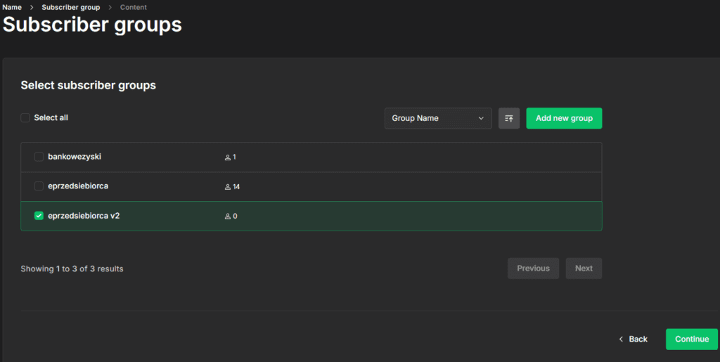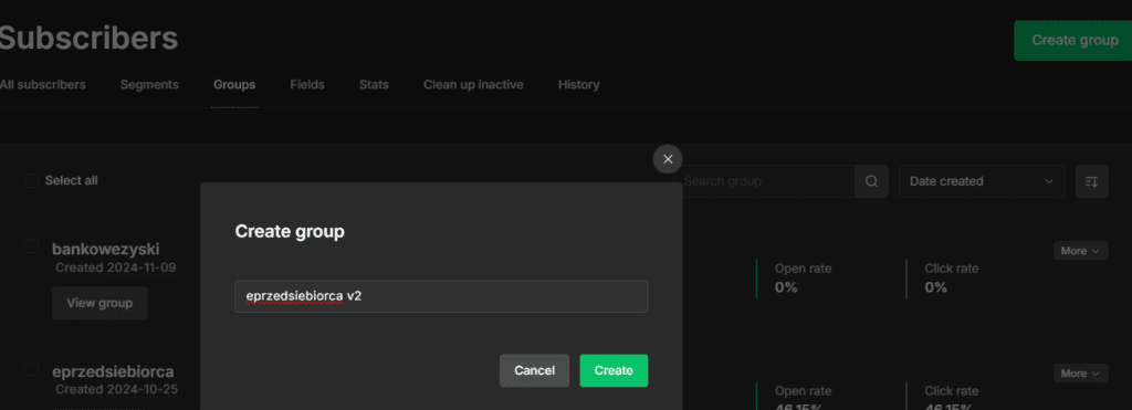 W tym celu wchodzimy w „Subscribers”–>”Groups”, po czym klikamy zielony przycisk „Create group”, oraz nadajemy nazwę grupie. Ważne, by była ona informatywna dla ciebie, np. „klienci sklepu Wesoła Pana”