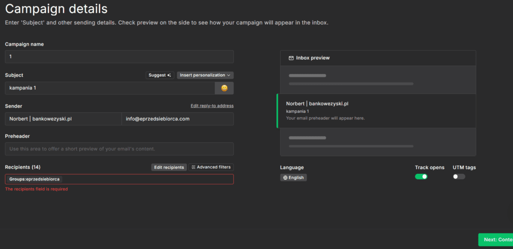 Następnie wpisujesz nazwę kampanii, oraz to, co twoi odbiorcy zobaczą na swojej poczcie, czyli nadawcę, temat, oraz kawałek tekstu. W MailerLite fajne jest to, że po prawej stronie masz podgląd. Wybierz również grupę adresów e-mail, do których będziesz kierować kampanię.