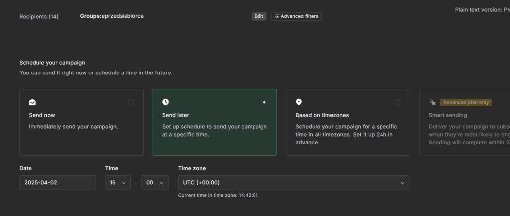 Gdy utworzysz wiadomość, możesz wysłać ją od razu lub zaplanować wysyłkę na inny termin. Możesz też wysłać wiadomość testową, by przekonać się, że wszystko jest ustawione prawidłowo.