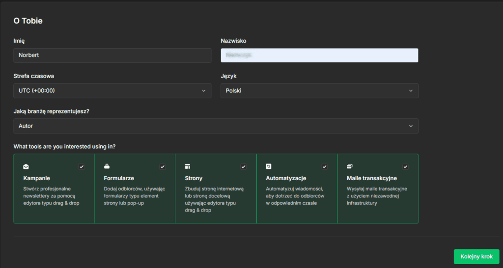 Następnie musisz podać kilka informacji o sobie, m.in. imię i nazwisko, branżę, oraz jakie narzędzie najbardziej cię interesują. Najlepiej zaznacz wszystkie opcje.