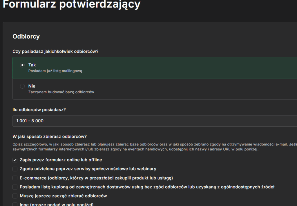 W ostatnim kroku konfiguracyjnym odpowiedz jeszcze na pytania dotyczące tego, czy masz już jakieś adresy e-mail, a także czy masz stronę internetową. Jeśli masz, będzie potrzebna jej weryfikacja, jednak MailerLite udziela wskazówek, co i jak.