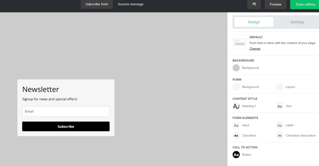 Pamiętaj również o tym, by zaprojektować formularz dziękujący za zapis do newslettera. Znajduje się on na górze, w zakładce „Success message”.