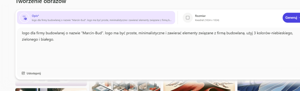 Cały proces tworzenia logo polega na wpisaniu tego, czego potrzebujemy. W pole „Opis” musimy wpisać dokładną komendę jakie logo nas interesuje. Aby dać ci przykładowe logo, ja wpisałem następującą komendę: „logo dla firmy budowlanej o nazwie „Marcin-Bud”. logo ma być proste, minimalistyczne i zawierać elementy związane z firmą budowlaną. użyj 3 kolorów-niebieskiego, zielonego i białego.”