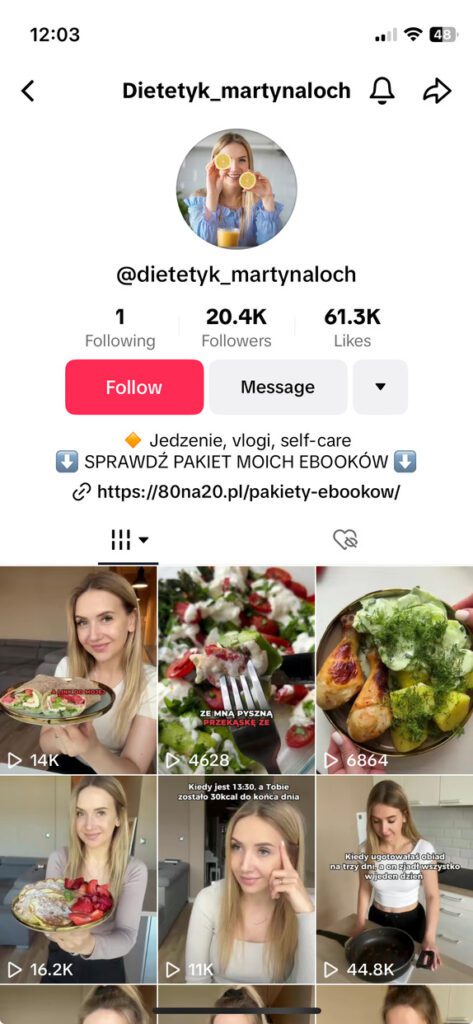 Bardzo wielu twórców TikToka zarabia na e-bookach. Przykładem może być konto @dietetyk_martynaloch. Martyna prowadzi kontent lifestylowy oraz o zdrowym odżywianiu. Postanowiła więc napisać kilka e-booków, które sprzedaje pojedynczo, bądź w pakietach. Linki do e-booków umieszcza w swoim bio, a w swoich filmikach informuje o promocjach na nie, oraz dodaje przykładowe przepisy, które można znaleźć w e-bookach.