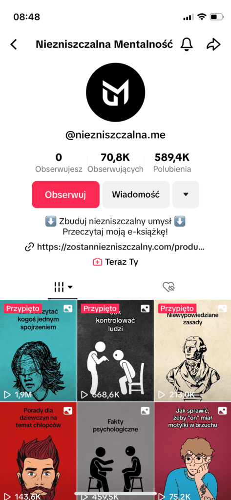 Tego typu kontem jest Niezniszczalna Mentalność. Na ten moment konto to już nie istnieje, jednak chciałem podać przykład, że nie musisz być influencerem, by zarabiać na e-bookach.