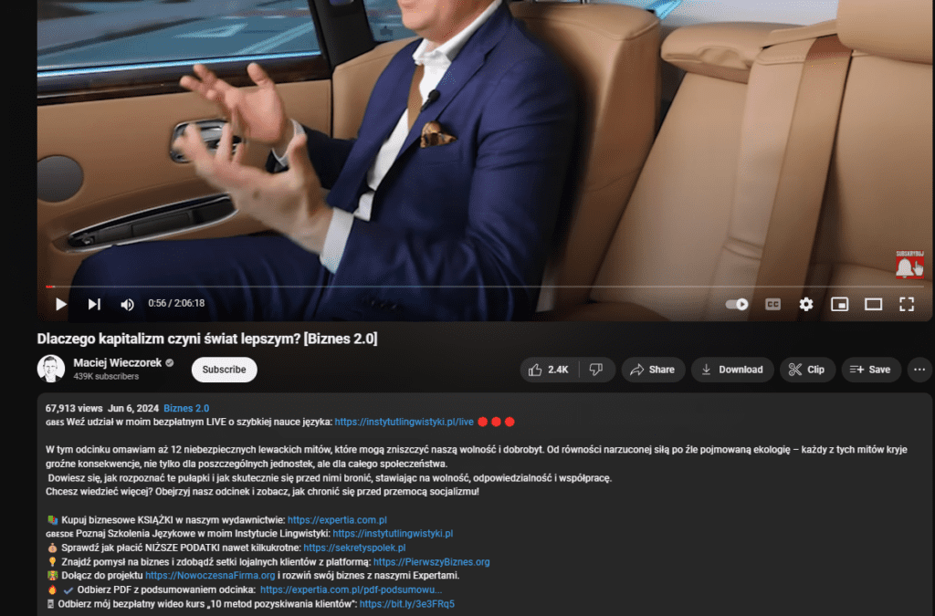 Kanałem, który wykorzystuje tę strategię jest Maciej Wieczorek. Publikuje on treści związane z biznesem, gospodarką i przedsiębiorczością, a przy okazji promuje swoje produkty, w tym kursy. Przykładowo, jeden z jego kursów o nazwie Pierwszy Biznes jest sprzedawany za 997 zł, a biorąc pod uwagę generowane przez niego wyświetlenia, z pewnością autor nieźle na nim zarabia.