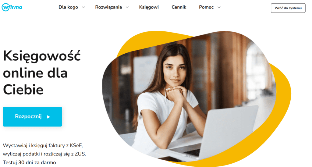 | 1. wFirma | 49 zł/mies. | Początkujące małe firmy na KPiR/ryczałcie | Bardzo prosta | 30 dni | ✅ | ✅ | ✅ | 9,8/10 |