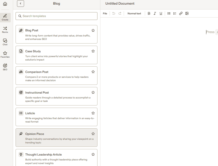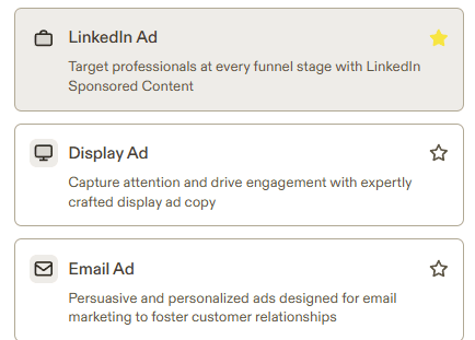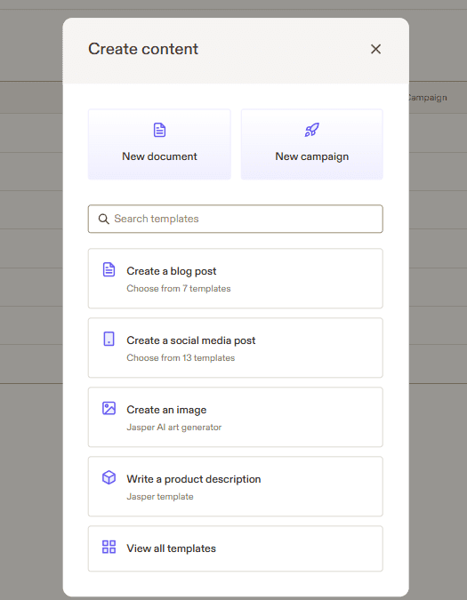 Gdy chcemy stworzyć tekst z Jasper AI, na samym początku wybieramy szablon tekstu, czyli innymi słowy podpowiadamy programowi, jakiego rodzaju tekst ma nam stworzyć. Dzięki temu dostosuje treść do jej rodzaju.