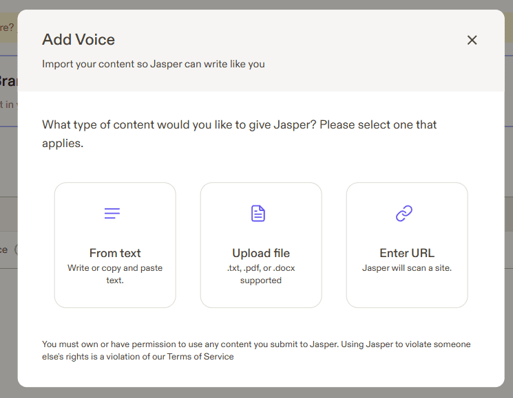 Jasper AI umożliwia również wprowadzenie indywidualnego głosu marki. Mówiąc prosto, indywidualny głos marki sprawia, że Jasper AI pisze takim stylem, jak twój. Ale jak Jasper AI może nauczyć się twojego stylu?